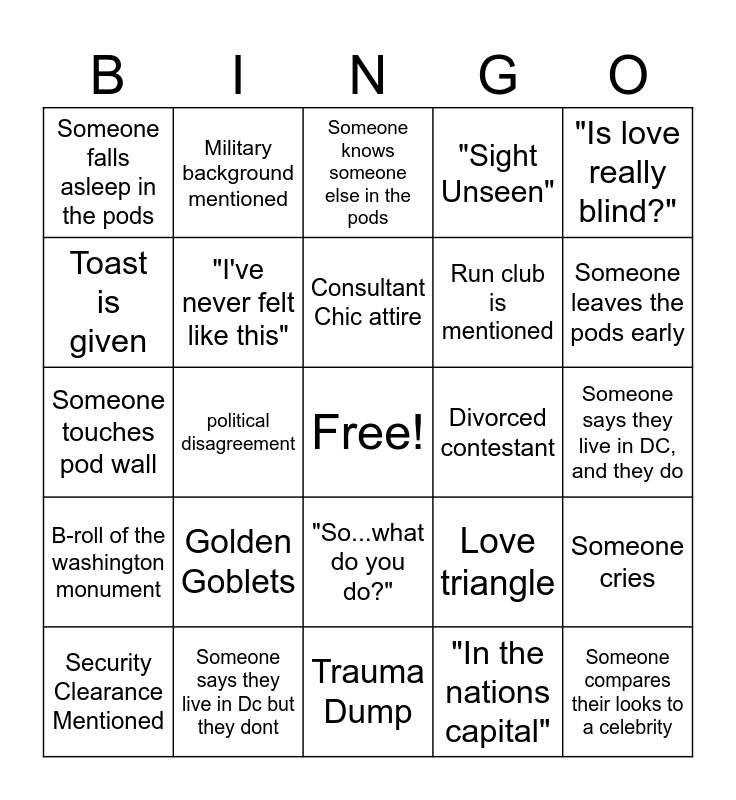 This bingo card has a free space and 24 words: Golden Goblets, Someone says they live in Dc but they dont, Consultant Chic attire, Security Clearance Mentioned, "Is love really blind?", Someone falls asleep in the pods, Toast is given, Military background mentioned, Divorced contestant, "So...what do you do?", Run club is mentioned, Someone touches pod wall, Love triangle, Someone cries, "I've never felt like this", "In the nations capital", Someone says they live in DC, and they do, Someone knows someone else in the pods, Someone leaves the pods early, political disagreement, Someone compares their looks to a celebrity, B-roll of the washington monument, "Sight Unseen" and Trauma Dump.
