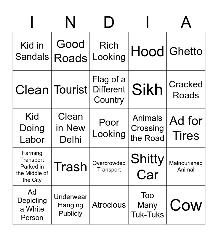 This bingo card has a free space and 24 words: Trash, Underwear Hanging Publicly, Flag of a Different Country, Ad Depicting a White Person, Ghetto, Kid in Sandals, Clean, Good Roads, Animals Crossing the Road, Overcrowded Transport, Sikh, Kid Doing Labor, Shitty Car, Malnourished Animal, Tourist, Too Many Tuk-Tuks, Ad for Tires, Rich Looking, Cracked Roads, Clean in New Delhi, Cow, Farming Transport Parked in the Middle of the City, Hood and Atrocious.