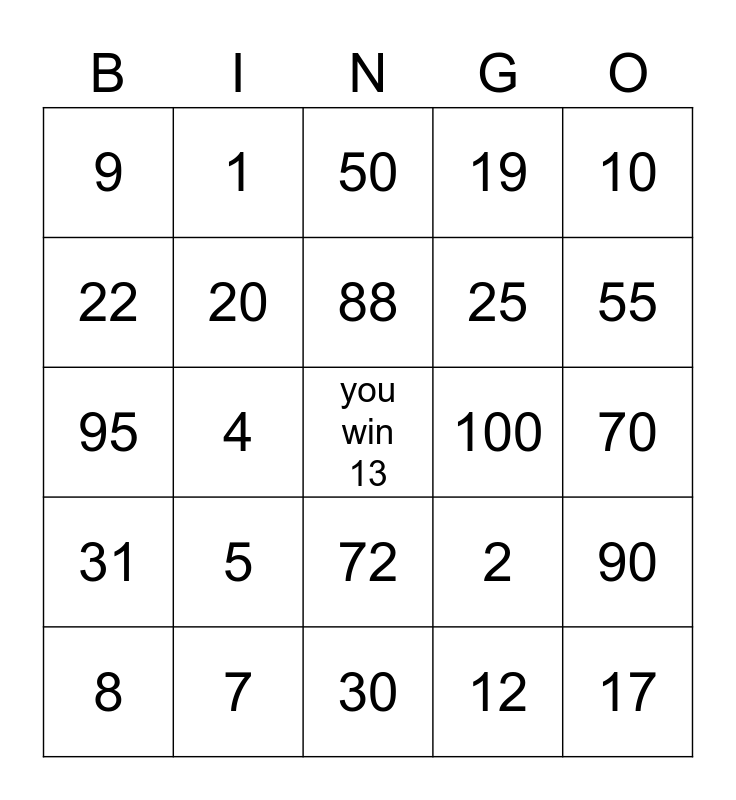 This bingo card has a free space and 24 words: 5, 7, 88, 8, 10, 9, 22, 1, 100, 72, 25, 95, 2, 90, 20, 12, 70, 50, 55, 4, 17, 31, 19 and 30.