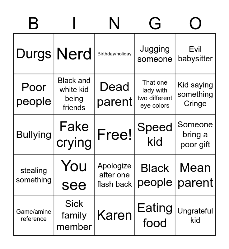 This bingo card has a free space and 24 words: You see, Sick family member, Dead parent, Game/amine reference, Evil babysitter, Durgs, Poor people, Nerd, Speed kid, Apologize after one flash back, That one lady with two different eye colors, Bullying, Black people, Mean parent, Black and white kid being friends, Eating food, Someone bring a poor gift, Birthday/holiday, Kid saying something Cringe, Fake crying, Ungrateful kid, stealing something, Jugging someone and Karen.