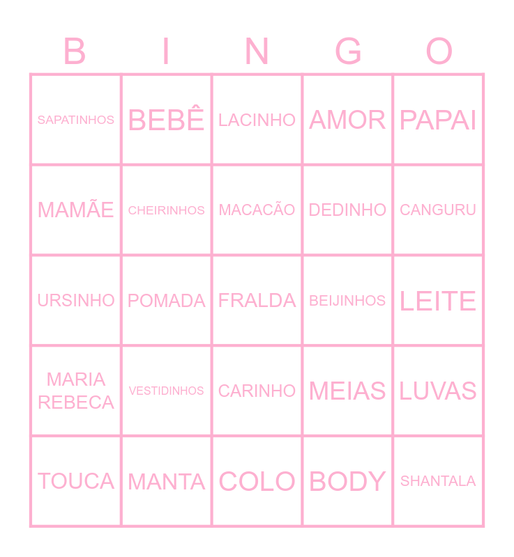This bingo card has a free space and 24 words: VESTIDINHOS, MANTA, MACACÃO, TOUCA, PAPAI, SAPATINHOS, MAMÃE, BEBÊ, BEIJINHOS, CARINHO, DEDINHO, URSINHO, MEIAS, LUVAS, CHEIRINHOS, BODY, LEITE, LACINHO, CANGURU, POMADA, SHANTALA, MARIA REBECA, AMOR and COLO.