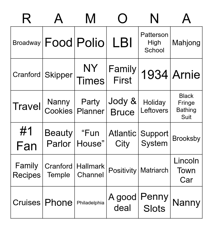This bingo card has 40 words: Philadelphia, 1934, Art Teacher, Cranford, Atlantic City, Black Fringe Bathing Suit, Skipper, Philadelphia College of Arts, Patterson High School, Jody & Bruce, Arnie, LBI, Travel, Party Planner, Nanny Cookies, Holiday Leftovers, Lincoln Town Car, Broadway, A good deal, Polio, Beauty Parlor, Brooksby, NY Times, Mahjong, Penny Slots, Positivity, Cranford Temple, Nanny, Family Recipes, Hallmark Channel, 1956, “Fun House”, Cruises, #1 Fan, Family First, Support System, Matriarch, Phone, Food and Cards.