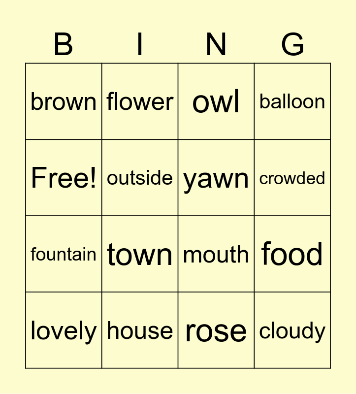 This bingo card has 16 words: house, food, owl, brown, fountain, flower, mouth, rose, Free!, outside, lovely, balloon, town, crowded, yawn and cloudy.