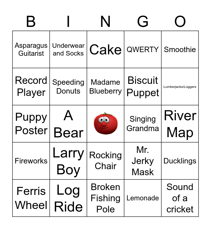 This bingo card has a free space and 42 words: Tuba, Madame Blueberry, Cheerleaders in a canoe, Larry Boy, Lemonade, Ducklings, Sound of a cricket, Bow Tie, Cake, Rocking Chair, River Map, Lumberjacks/Loggers, A Bear, Smoothie, Measuring Tape, Mr. Jerky Mask, Monkey playing Guitar, Puppy Poster, Signal Flare, Underwear and Socks, Record Player, Lanterns, Rocket Backpack, Asparagus Guitarist, Statue of Liberty, Pink Chimney, Biscuit Puppet, Coffee Shop, Ball of Yarn, Eiffel Tower, Old Man with a Cane, Fireworks, Speeding Donuts, Broken Fishing Pole, Hot Air Balloon, Ferris Wheel, Log Ride, Singing Grandma, Broken Stage, Tripping on a Banjo, QWERTY and Bible Verse.