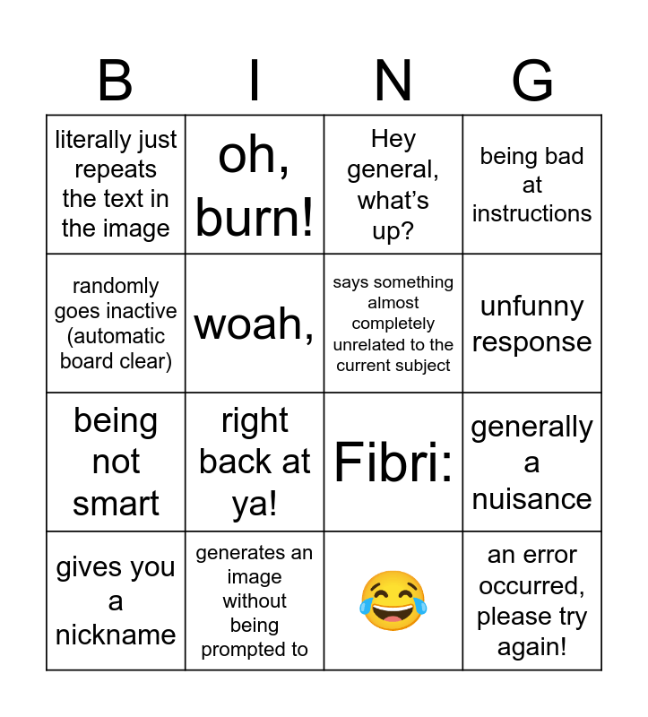 This bingo card has 16 words: generates an image without being prompted to, generally a nuisance, Hey general, what’s up?, literally just repeats the text in the image, being not smart, oh, burn!, Fibri:, 😂, randomly goes inactive (automatic board clear), woah,, gives you a nickname, being bad at instructions, right back at ya!, unfunny response, says something almost completely unrelated to the current subject and an error occurred, please try again!.