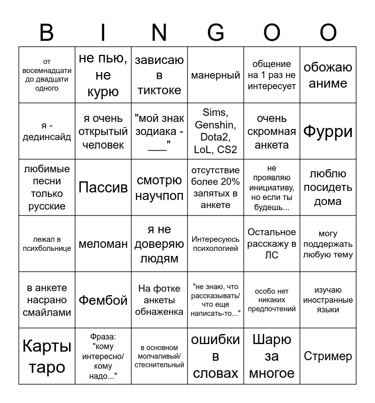 This bingo card has 36 words: лежал в психбольнице, меломан, в основном молчаливый/стеснительный, Sims, Genshin, Dota2, LoL, CS2, не проявляю инициативу, но если ты будешь..., люблю посидеть дома, от восемнадцати до двадцати одного, Фраза: "кому интересно/кому надо...", зависаю в тиктоке, "не знаю, что рассказывать/что еще написать-то...", очень скромная анкета, обожаю аниме, в анкете насрано смайлами, Пассив, "мой знак зодиака - ___", манерный, особо нет никаких предпочтений, могу поддержать любую тему, я - дединсайд, я очень открытый человек, я не доверяю людям, Интересуюсь психологией, Остальное расскажу в ЛС, изучаю иностранные языки, любимые песни только русские, не пью, не курю, смотрю научпоп, ошибки в словах, общение на 1 раз не интересует, Фурри, Карты таро, Фембой, На фотке анкеты обнаженка, отсутствие более 20% запятых в анкете, Шарю за многое and Стример.