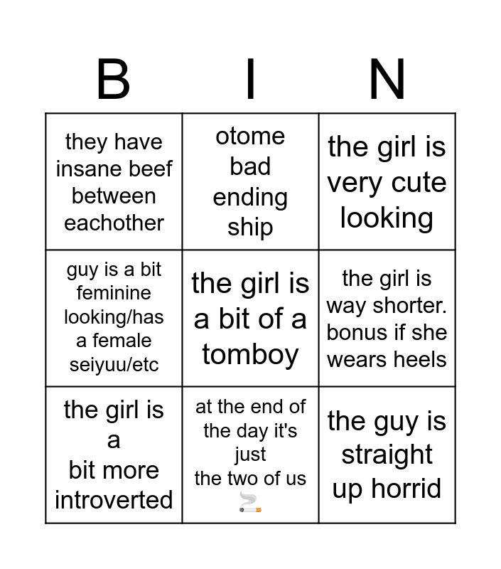 This bingo card has a free space and 8 words: the girl is way shorter. bonus if she wears heels, the girl is very cute looking, otome bad ending ship, the girl is a bit more introverted, they have insane beef between eachother, the guy is straight up horrid, guy is a bit feminine looking/has a female seiyuu/etc and at the end of the day it's just the two of us 🚬.