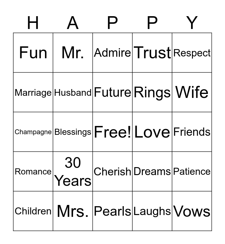 This bingo card has a free space and 24 words: 30 Years, Mrs., Future, Children, Respect, Fun, Marriage, Mr., Love, Cherish, Rings, Champagne, Dreams, Patience, Husband, Laughs, Friends, Admire, Wife, Blessings, Vows, Romance, Trust and Pearls.