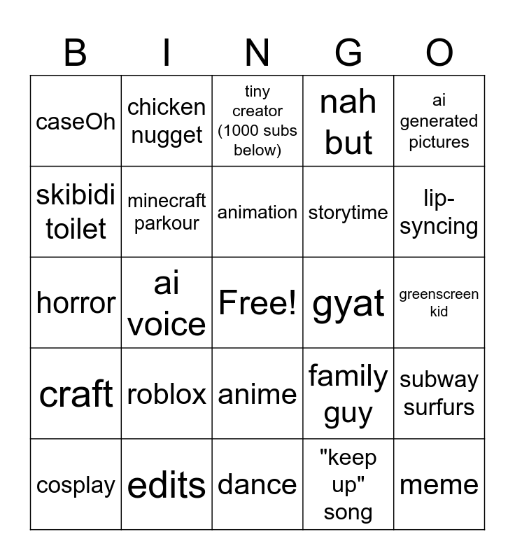 This bingo card has a free space and 24 words: roblox, edits, animation, cosplay, ai generated pictures, caseOh, skibidi toilet, chicken nugget, gyat, anime, storytime, horror, family guy, subway surfurs, minecraft parkour, "keep up" song, greenscreen kid, tiny creator (1000 subs below), lip-syncing, ai voice, meme, craft, nah but and dance.