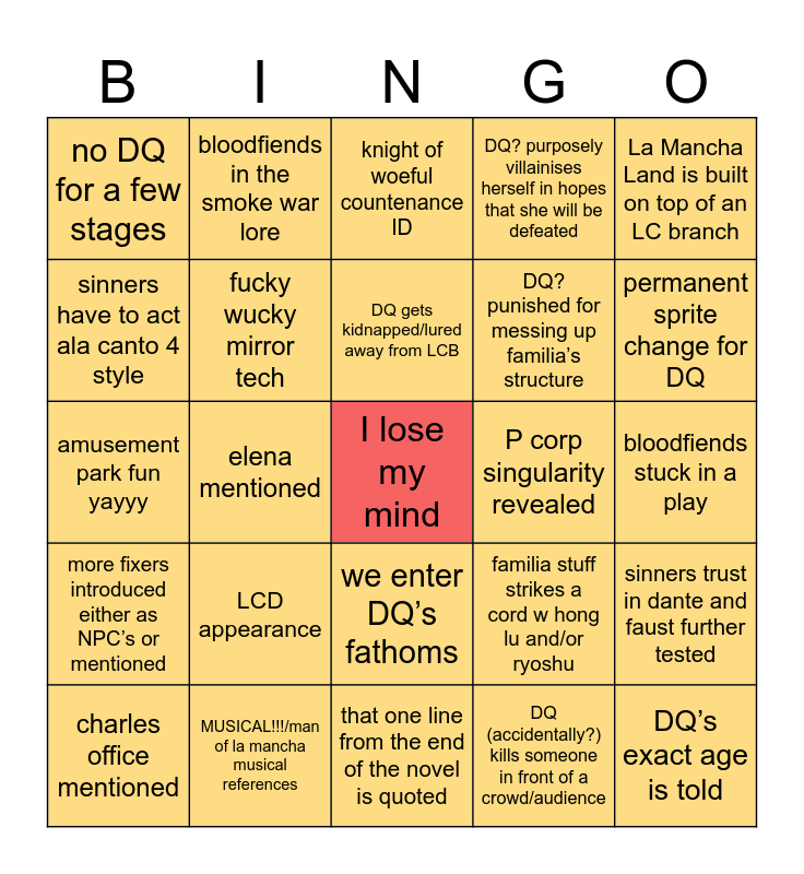 This bingo card has a free space and 24 words: LCD appearance, MUSICAL!!!/man of la mancha musical references, DQ gets kidnapped/lured away from LCB, charles office mentioned, La Mancha Land is built on top of an LC branch, no DQ for a few stages, sinners have to act ala canto 4 style, bloodfiends in the smoke war lore, P corp singularity revealed, we enter DQ’s fathoms, DQ? punished for messing up familia’s structure, amusement park fun yayyy, familia stuff strikes a cord w hong lu and/or ryoshu, sinners trust in dante and faust further tested, fucky wucky mirror tech, DQ (accidentally?) kills someone in front of a crowd/audience, bloodfiends stuck in a play, knight of woeful countenance ID, permanent sprite change for DQ, elena mentioned, DQ’s exact age is told, more fixers introduced either as NPC’s or mentioned, DQ? purposely villainises herself in hopes that she will be defeated and that one line from the end of the novel is quoted.