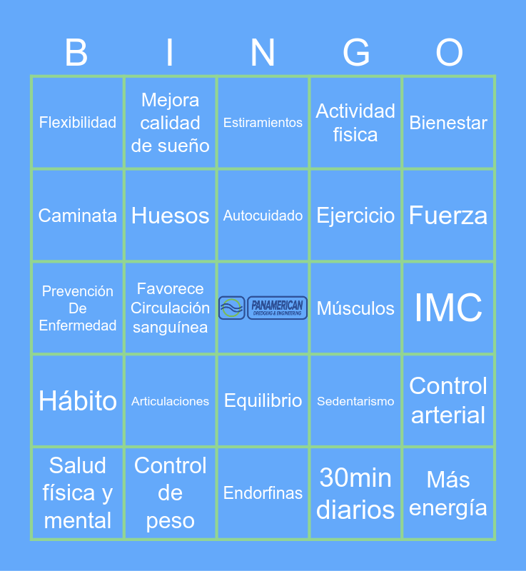 This bingo card has a free space and 29 words: Salud física y mental, Corazón sano, Favorece Circulación sanguínea, Movilidad, Flexibilidad, Estiramientos, Huesos, Articulaciones, Músculos, Control de peso, IMC, Más energía, Endorfinas, 30min diarios, Fuerza, Postura, Equilibrio, Hábito, Bienestar, Prevención De Enfermedad, Sedentarismo, Manejo de estrés, Ejercicio, Caminata, Actividad fisica, Mejora calidad de sueño, Control arterial, Autocuidado and Obesidad.