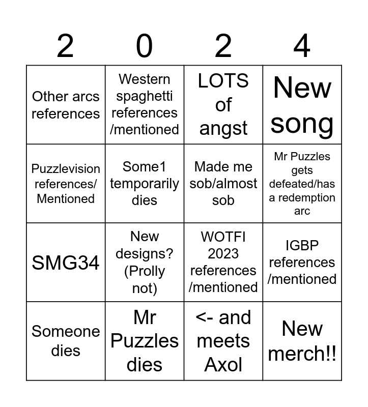 This bingo card has 16 words: Someone dies, Mr Puzzles dies, LOTS of angst, New song, Puzzlevision references/ Mentioned, Western spaghetti references /mentioned, WOTFI 2023 references /mentioned, IGBP references /mentioned, Other arcs references, Some1 temporarily dies, <- and meets Axol, Mr Puzzles gets defeated/has a redemption arc, SMG34, New designs? (Prolly not), Made me sob/almost sob and New merch!!.