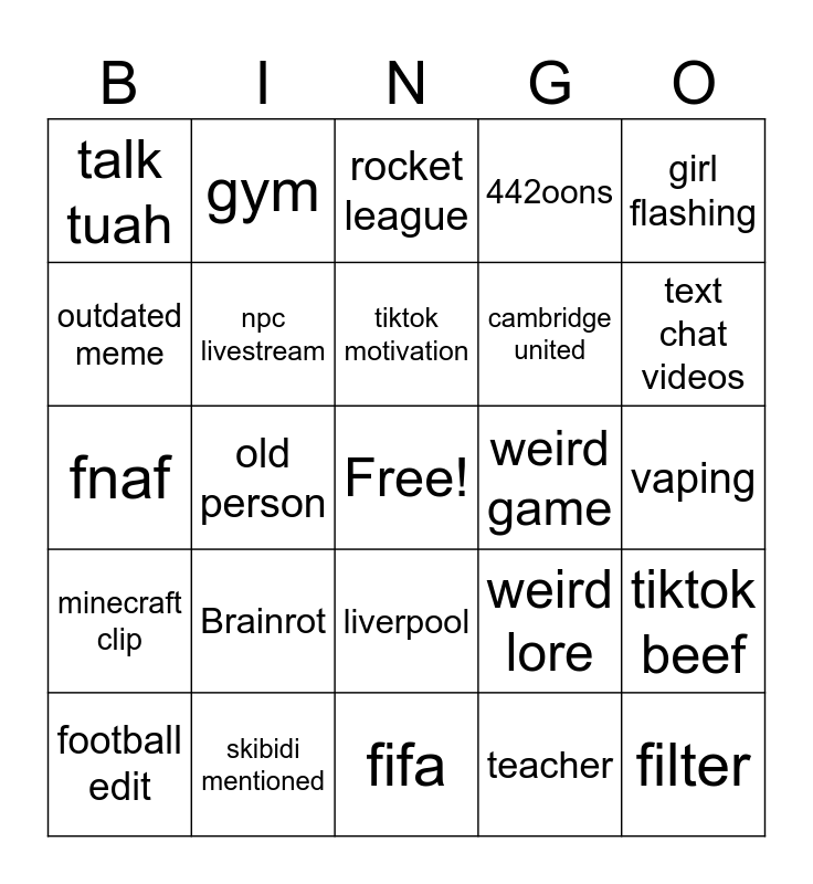 This bingo card has a free space and 24 words: Brainrot, skibidi mentioned, tiktok motivation, football edit, girl flashing, talk tuah, outdated meme, gym, weird game, liverpool, cambridge united, fnaf, weird lore, tiktok beef, npc livestream, teacher, vaping, rocket league, text chat videos, old person, filter, minecraft clip, 442oons and fifa.
