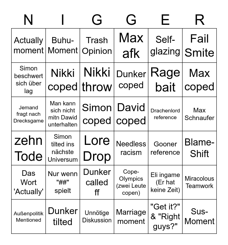 This bingo card has 36 words: Cope-Olympics (zwei Leute copen), Dunker called ff, Marriage moment, Simon beschwert sich über lag, zehn Tode, David coped, Nikki coped, Unnötige Diskussion, Self- glazing, Eli ingame (Er hat keine Zeit), Max coped, Max afk, Miracolous Teamwork, Man kann sich nicht mitn Dawid unterhalten, Dunker coped, Actually moment, Das Wort 'Actually', Drachenlord reference, Jemand fragt nach Drecksgame, Trash Opinion, Simon coped, Simon tilted ins nächste Universum, Needless racism, Lore Drop, Gooner reference, Buhu- Moment, Rage bait, Dunker tilted, Nikki throw, Fail Smite, Sus- Moment, Außenpolitik Mentioned, Blame- Shift, Max Schnaufer, Nur wenn "##" spielt and "Get it?" & "Right guys?".