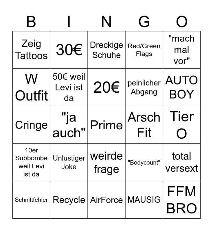 This bingo card has a free space and 24 words: Unlustiger Joke, Recycle, 20€, Schnittfehler, "mach mal vor", Zeig Tattoos, W Outfit, 30€, Arsch Fit, weirde frage, peinlicher Abgang, Cringe, "Bodycount", total versext, 50€ weil Levi ist da, MAUSIG, Tier O, Dreckige Schuhe, AUTO BOY, "ja auch", FFM BRO, 10er Subbombe weil Levi ist da, Red/Green Flags and AirForce.