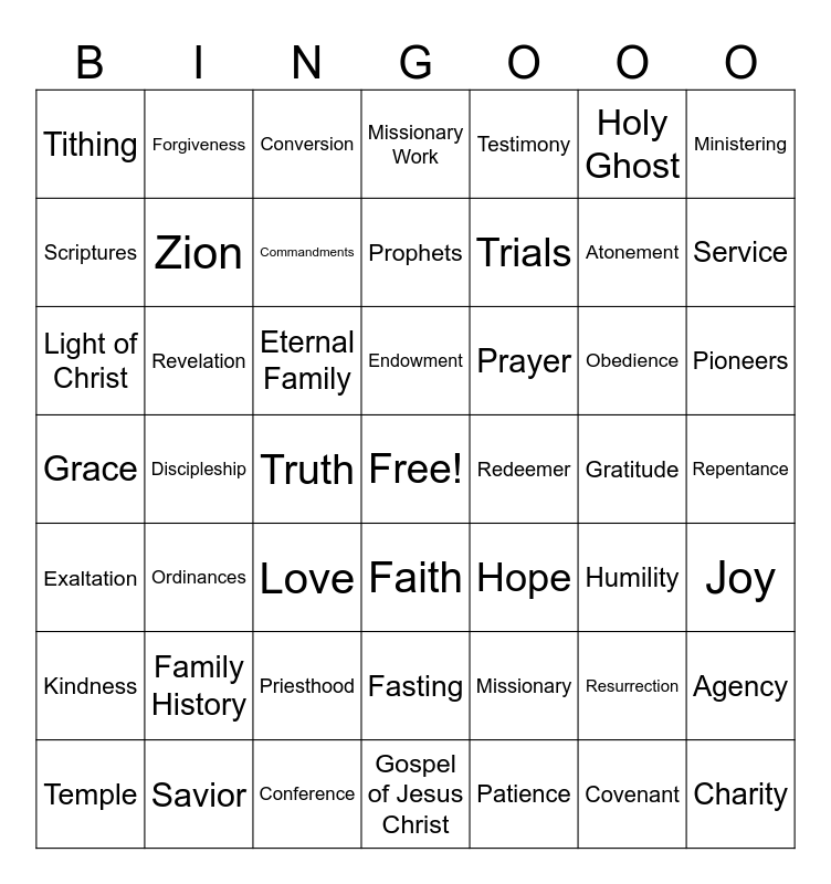 This bingo card has a free space and 50 words: Agency, Atonement, Covenant, Discipleship, Eternal Family, Faith, Forgiveness, Gospel of Jesus Christ, Holy Ghost, Hope, Ministering, Missionary Work, Obedience, Prayer, Priesthood, Repentance, Scriptures, Service, Temple, Testimony, Trials, Truth, Tithing, Zion, Savior, Charity, Commandments, Conference, Conversion, Endowment, Eternal Life, Exaltation, Family History, Fasting, Grace, Gratitude, Humility, Joy, Kindness, Light of Christ, Love, Missionary, Ordinances, Patience, Pioneers, Prophets, Redeemer, Resurrection, Revelation and Sacrifice.