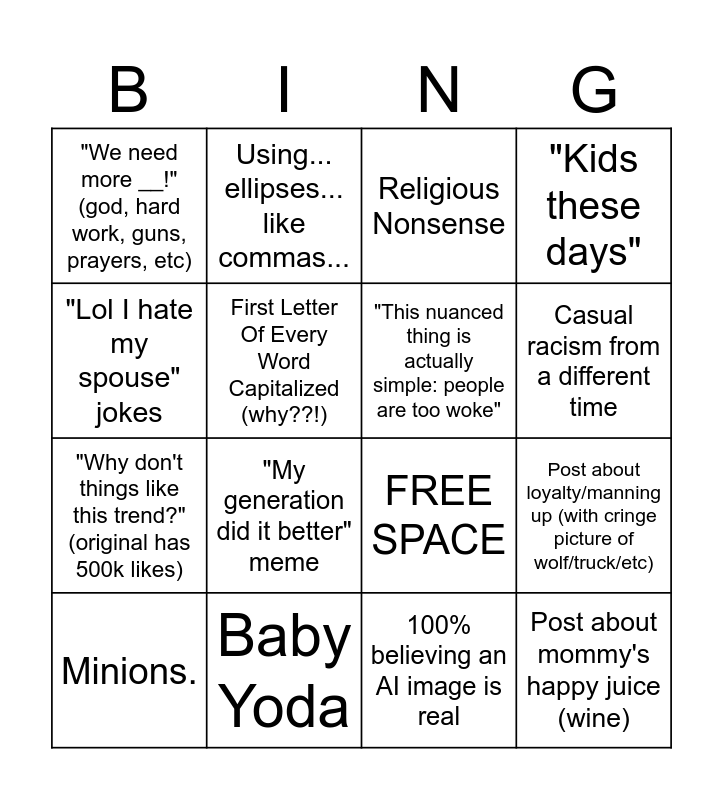 This bingo card has 16 words: Minions., Baby Yoda, Religious Nonsense, "Kids these days", "Lol I hate my spouse" jokes, Using... ellipses... like commas..., FREE SPACE, Post about loyalty/manning up (with cringe picture of wolf/truck/etc), "We need more __!" (god, hard work, guns, prayers, etc), First Letter Of Every Word Capitalized (why??!), 100% believing an AI image is real, Casual racism from a different time, "Why don't things like this trend?" (original has 500k likes), "My generation did it better" meme, "This nuanced thing is actually simple: people are too woke" and Post about mommy's happy juice (wine).
