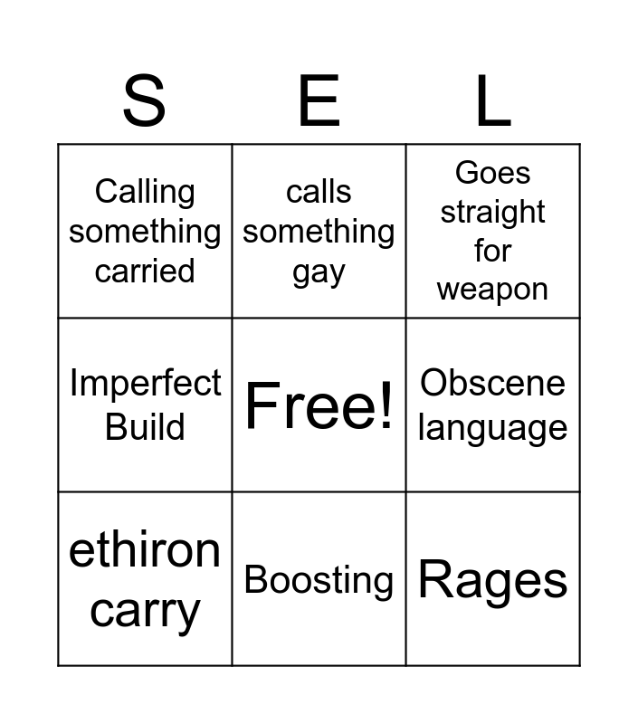 This bingo card has a free space and 15 words: Missing a lot of talents, Kit Siphon, Goes straight for weapon, Calling something carried, Boosting, Rages, Goes Silent, Asks for TP, Obscene language, Asks for tp, Refusal to learn L2, Imperfect Build, ethiron carry, calls something gay and Wipes from skill issue.