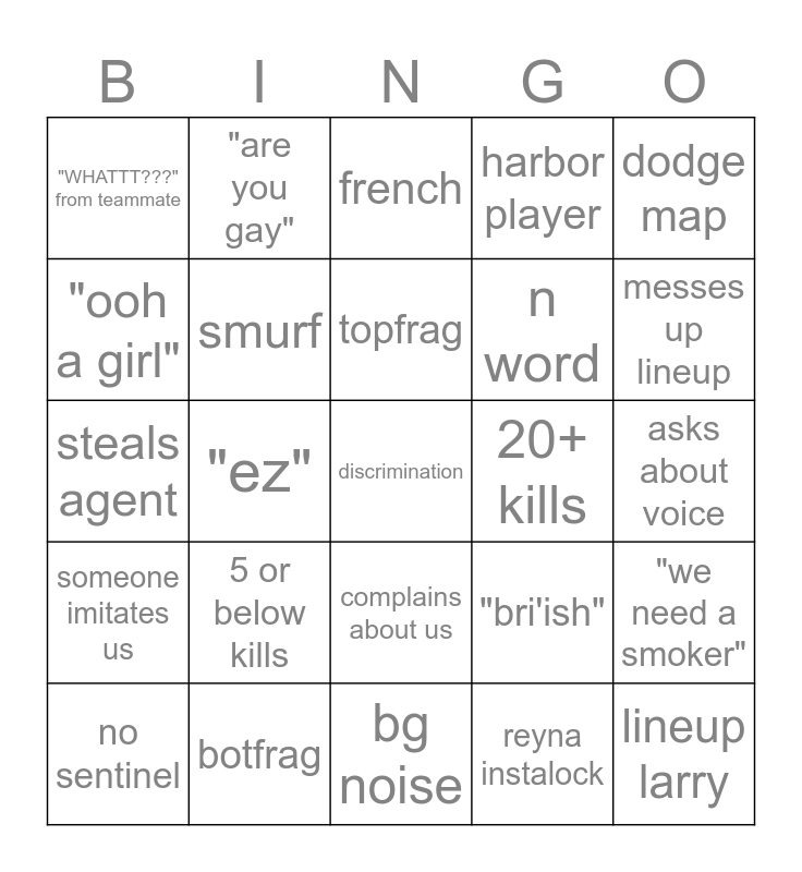 This bingo card has a free space and 26 words: complains about us, reyna instalock, topfrag, botfrag, dodge map, "WHATTT???" from teammate, "ooh a girl", "are you gay", asks about voice, "bri'ish", n word, steals agent, "we need a smoker", no sentinel, "ez", val crashes, harbor player, someone imitates us, french, lineup larry, messes up lineup, bg noise, 20+ kills, 5 or below kills, smurf and streamer.