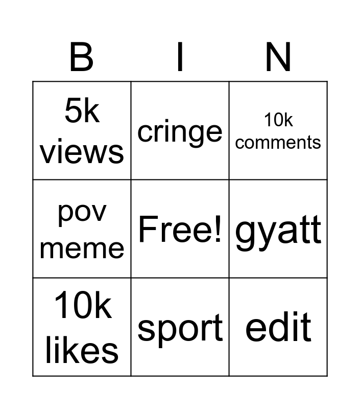 This bingo card has a free space and 8 words: pov meme, cringe, gyatt, 10k likes, 10k comments, 5k views, sport and edit.