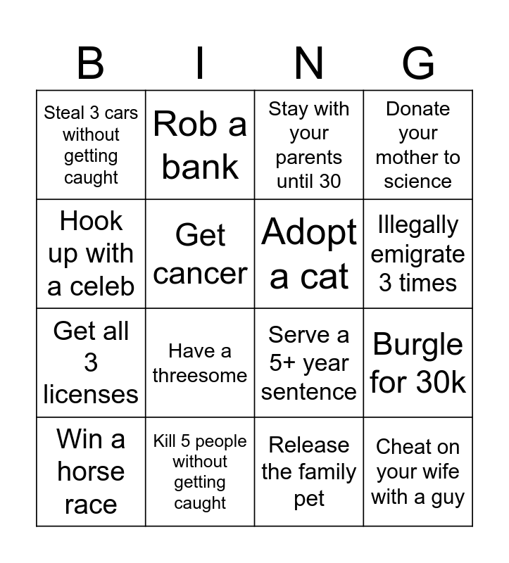 This bingo card has 21 words: Kill 5 people without getting caught, Kill somebody while under 12, Rob a bank, Kill for 1M+ from inheritance, Release the family pet, Adopt a cat, Steal 3 cars without getting caught, Stay with your parents until 30, Serve a 5+ year sentence, Illegally emigrate 3 times, Get all 3 licenses, Donate your mother to science, Cheat on your wife with a guy, Go to rehab, Get cancer, Win 200k+ in the casino, Win a horse race, Have a threesome, Hook up with a celeb, Burgle for 30k and Don't get depression until 40.