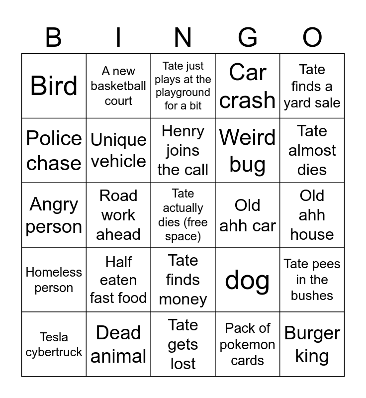 This bingo card has a free space and 24 words: Half eaten fast food, Dead animal, Henry joins the call, Tesla cybertruck, Tate finds a yard sale, Bird, Police chase, A new basketball court, Old ahh car, Tate finds money, Weird bug, Angry person, dog, Tate pees in the bushes, Unique vehicle, Pack of pokemon cards, Old ahh house, Tate just plays at the playground for a bit, Tate almost dies, Road work ahead, Burger king, Homeless person, Car crash and Tate gets lost.