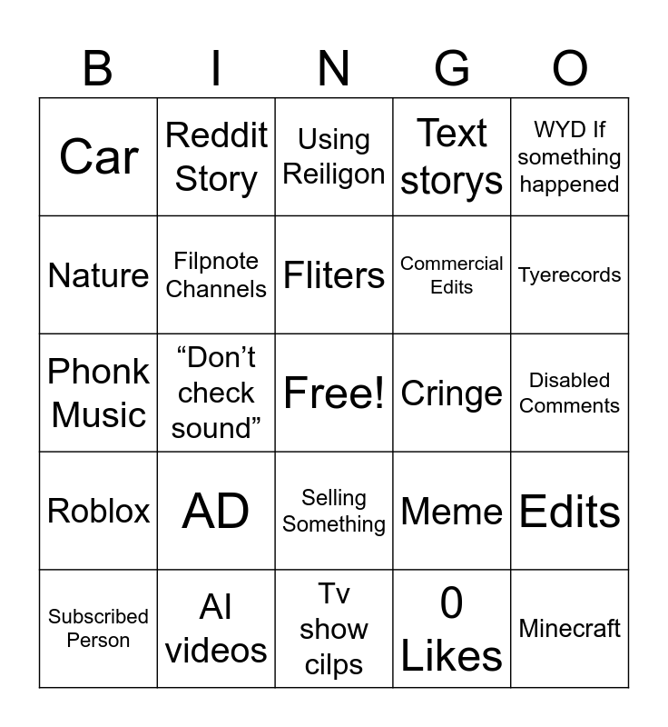 This bingo card has a free space and 24 words: AD, AI videos, Fliters, Subscribed Person, WYD If something happened, Car, Nature, Reddit Story, Cringe, Selling Something, Commercial Edits, Phonk Music, Meme, Edits, Filpnote Channels, 0 Likes, Disabled Comments, Using Reiligon, Tyerecords, “Don’t check sound”, Minecraft, Roblox, Text storys and Tv show cilps.