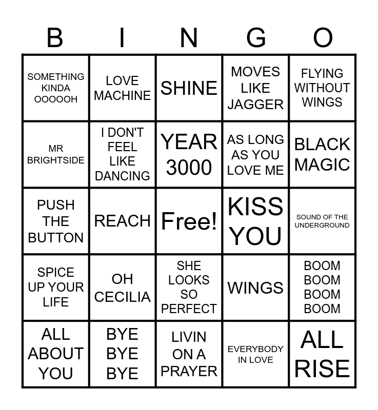 This bingo card has a free space and 45 words: I WANT IT THAT WAY, ALL RISE, GLAD YOU CAME, ALL ABOUT YOU, OBVIOUSLY, EVERYBODY IN LOVE, SHINE, EVERYBODY, FLYING WITHOUT WINGS, BYE BYE BYE, MOVES LIKE JAGGER, KISS YOU, SHE LOOKS SO PERFECT, OH CECILIA, UPTOWN GIRL, LIVIN ON A PRAYER, SHOUT OUT TO MY EX, PUSH THE BUTTON, C'EST LA VIE, BLACK MAGIC, LOVE MACHINE, WHOLE AGAIN, ETERNAL FLAME, SOMETHING KINDA OOOOOH, THE TIDE IS HIGH, SOUND OF THE UNDERGROUND, IT'S RAINING MEN, VENUS, WINGS, SPICE UP YOUR LIFE, GET DOWN ON IT, BOOM BOOM BOOM BOOM, WE'RE GOING TO IBIZA, DJ GOT US FALLIN IN LOVE, WANNABE, REACH, TRADEGY, BLAME IT ON THE WEATHERMAN, WHAT MAKES YOU BEAUTIFUL, YEAR 3000, MR BRIGHTSIDE, AS LONG AS YOU LOVE ME, ONE LOVE, I DON'T FEEL LIKE DANCING and RELIGHT MY FIRE.