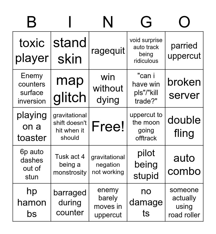 This bingo card has a free space and 24 words: Tusk act 4 being a monstrosity, barraged during counter, win without dying, hp hamon bs, parried uppercut, toxic player, Enemy counters surface inversion, stand skin, uppercut to the moon going offtrack, gravitational negation not working, "can i have win pls"/"kill trade?", playing on a toaster, pilot being stupid, auto combo, map glitch, no damage ts, double fling, ragequit, broken server, gravitational shift doesn't hit when it should, someone actually using road roller, 6p auto dashes out of stun, void surprise auto track being ridiculous and enemy barely moves in uppercut.
