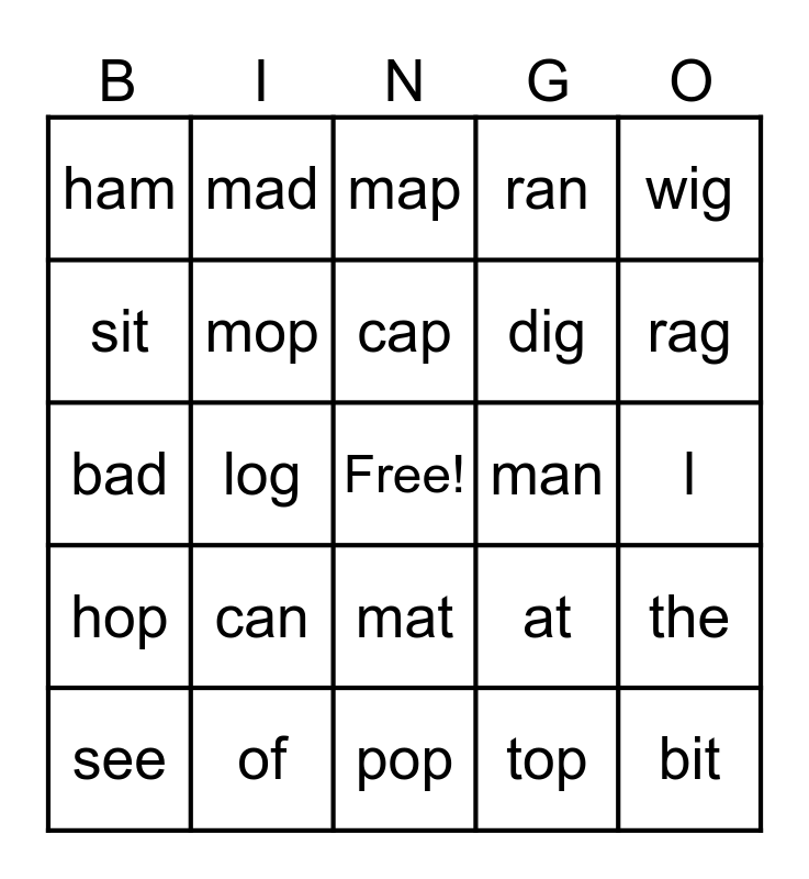 This bingo card has a free space and 49 words: cat, bit, sad, pop, can, fox, mad, ram, sit, on, mop, ran, the, at, it, is, cap, man, bid, wig, log, top, ham, dig, big, rag, see, fit, mat, hop, hit, fat, rat, hot, of, tap, big, bag, l, a, cop, him, fig, pot, bad, map, mom, dad and lit.