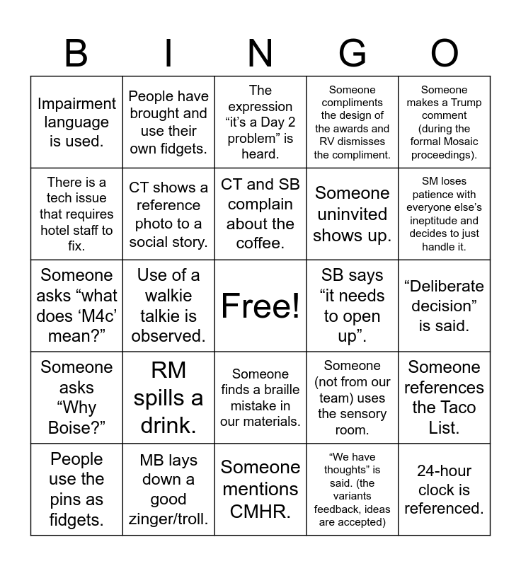 This bingo card has a free space and 29 words: People use the pins as fidgets., People comment on the glitter clipboards., Use of a walkie talkie is observed., The earcon plays., Impairment language is used., The expression “it’s a Day 2 problem” is heard., CT shows a reference photo to a social story., RM spills a drink., SB says “it needs to open up”., MB lays down a good zinger/troll., “Deliberate decision” is said., 24-hour clock is referenced., Someone mentions CMHR., “We have thoughts” is said. (the variants feedback, ideas are accepted), SM loses patience with everyone else’s ineptitude and decides to just handle it., People talk about shoes., Someone finds a braille mistake in our materials., Someone asks “Why Boise?”, Someone makes a Trump comment (during the formal Mosaic proceedings)., Someone asks “what does ‘M4c’ mean?”, Someone (not from our team) uses the sensory room., A member of the team cries., Someone uninvited shows up., There is a tech issue that requires hotel staff to fix., Someone compliments the design of the awards and RV dismisses the compliment., People have brought and use their own fidgets., Someone references the Taco List., CT and SB complain about the coffee. and There is a PowerPoint issue..