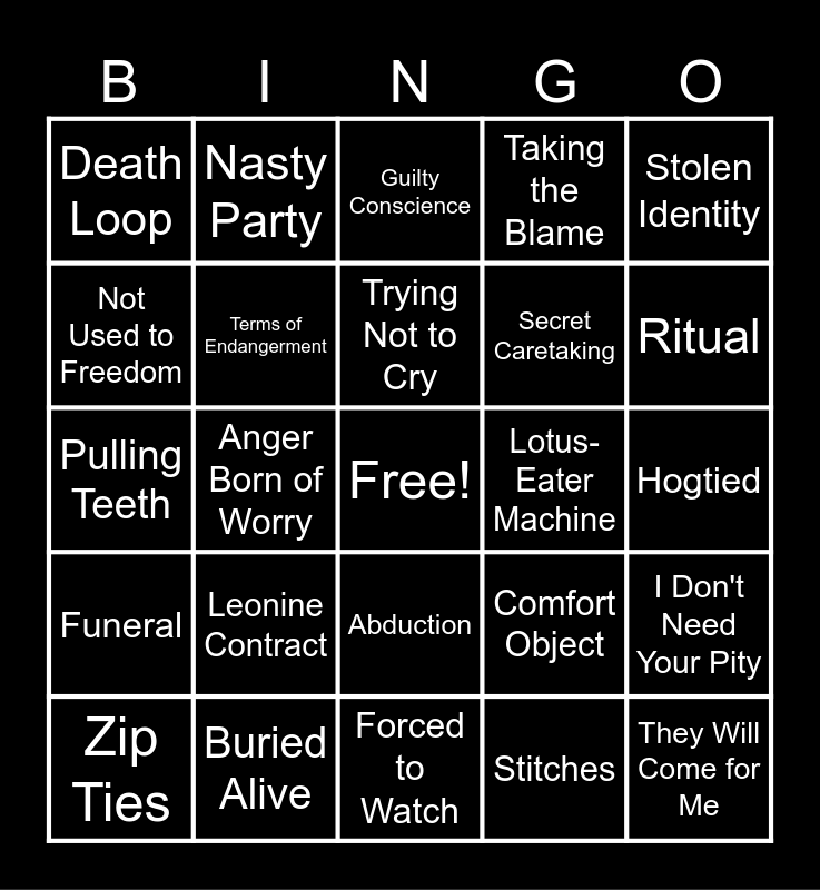 This bingo card has a free space and 24 words: Leonine Contract, Buried Alive, Trying Not to Cry, Zip Ties, Stolen Identity, Death Loop, Not Used to Freedom, Nasty Party, Lotus-Eater Machine, Abduction, Secret Caretaking, Pulling Teeth, Comfort Object, I Don't Need Your Pity, Terms of Endangerment, Stitches, Hogtied, Guilty Conscience, Ritual, Anger Born of Worry, They Will Come for Me, Funeral, Taking the Blame and Forced to Watch.