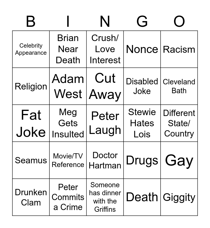 This bingo card has a free space and 24 words: Movie/TV Reference, Peter Commits a Crime, Cut Away, Drunken Clam, Racism, Celebrity Appearance, Religion, Brian Near Death, Stewie Hates Lois, Doctor Hartman, Disabled Joke, Fat Joke, Drugs, Gay, Adam West, Death, Different State/ Country, Crush/ Love Interest, Cleveland Bath, Meg Gets Insulted, Giggity, Seamus, Nonce and Someone has dinner with the Griffins.