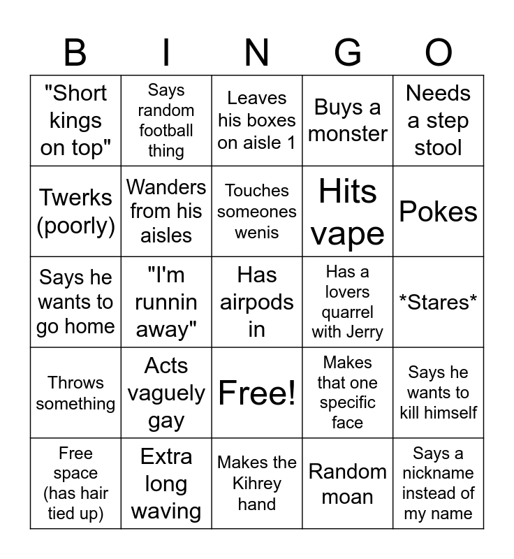 This bingo card has 26 words: Free!, Random moan, Touches someones wenis, Extra long waving, Needs a step stool, "Short kings on top", Twerks (poorly), Says random football thing, *Stares*, Makes that one specific face, Hits vape, Says he wants to go home, Says he wants to kill himself, Free space (has hair tied up), "I'm runnin away", Awkward high five, Buys a monster, Throws something, Leaves his boxes on aisle 1, Has airpods in, Pokes, Makes the Kihrey hand, Has a lovers quarrel with Jerry, Acts vaguely gay, Wanders from his aisles and Says a nickname instead of my name.