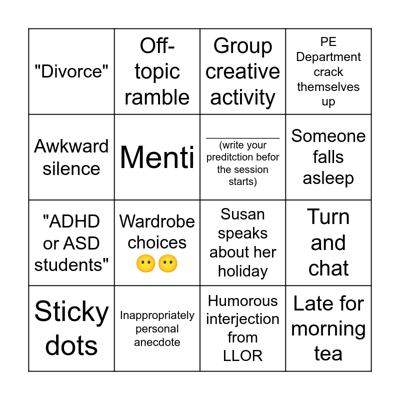 This bingo card has 16 words: Inappropriately personal anecdote, Turn and chat, Group creative activity, "Divorce", "ADHD or ASD students", Off-topic ramble, Susan speaks about her holiday, Humorous interjection from LLOR, Awkward silence, Menti, Sticky dots, PE Department crack themselves up, Wardrobe choices 😶😶, Someone falls asleep, _____________ (write your preditction befor the session starts) and Late for morning tea.