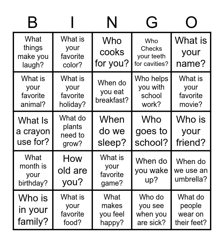 This bingo card has a free space and 24 words: How old are you?, What is your favorite food?, When do you eat breakfast?, Who is in your family?, What is your name?, What things make you laugh?, What is your favorite animal?, What is your favorite color?, Who goes to school?, What is your favorite game?, Who helps you with school work?, What Is a crayon use for?, When do you wake up?, When do we use an umbrella?, What is your favorite holiday?, Who do you see when you are sick?, Who is your friend?, Who cooks for you?, What is your favorite movie?, What do plants need to grow?, What do people wear on their feet?, What month is your birthday?, Who Checks your teeth for cavities? and What makes you feel happy?.