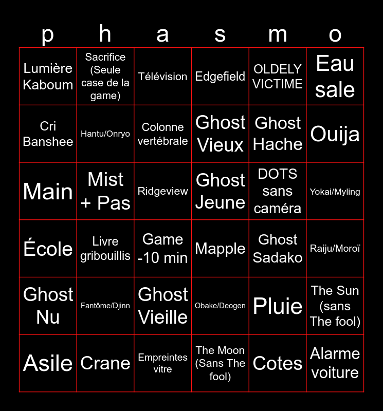 This bingo card has 83 words: Ballon qui bouge, Téléphone qui vibre, Télévision, Caméra qui tombe, Livre balancé, Crucifix 100%, 25 santés (+ quête), Photo fantôme (+ quête), Alarme voiture, Appareil qui s'allume, Poupée (rire/téléporte), Cri Deogen, Cri Banshee, Mist + Pas, Lumière Rouge, Lumière Kaboum, Game -10 min, Eau sale, Game parfaite, Crane, Cotes, Colonne vertébrale, Main, Pied, Ouija, Miroir, Patte de singe, Tarot, Cercle, Boite à musique, DOTS sans caméra, Empreintes interrupteur, Empreintes vitre, Ghost Hache, Ghost Nu, Ghost Vieille, Ghost Sadako, Ghost Gosse, Ghost Vieux, Ghost Jeune, The Sun (sans The fool), The Moon (Sans The fool), Cauchemar/ Démence sans mort, Lumière à feu (+quête), Son parabole (+ quête), Seul survivant (Seule case validé de la game), Sacrifice (Seule case de la game), Willow, Tangelwood, Prison, École, Edgefield, Ridgeview, Grafton, Bleasdale, Point Hope, Asile, Camp, Mapple, Eteins le courant, Allume le courant, Eteins une lumiere, allume une lumiere, OLDELY VICTIME, Livre 666, Livre gribouillis, Température - de -5, Pluie, Crépuscule, Neige, Brouillard, Esprit/Poltergeist, Cauchemar/Demon, Yokai/Myling, Raiju/Moroï, Spectre/Banshee, Revenant/Yurei, Hantu/Onryo, Obake/Deogen, Fantôme/Djinn, Ombre/Oni, Goryo/Jumeaux and Mimic/Thayé.