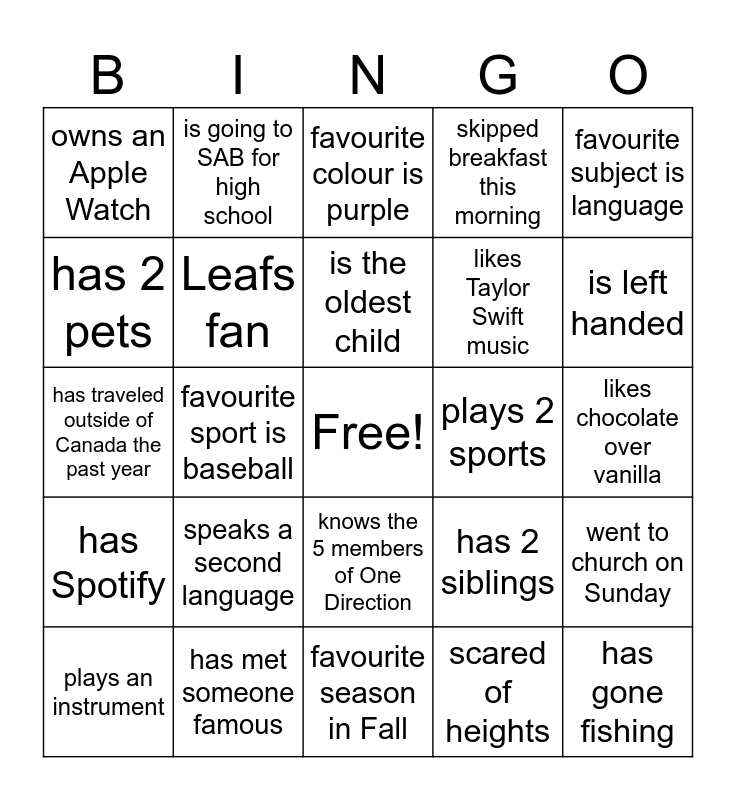This bingo card has a free space and 24 words: speaks a second language, has met someone famous, is the oldest child, plays an instrument, favourite subject is language, owns an Apple Watch, has 2 pets, is going to SAB for high school, plays 2 sports, knows the 5 members of One Direction, likes Taylor Swift music, has traveled outside of Canada the past year, has 2 siblings, went to church on Sunday, Leafs fan, scared of heights, likes chocolate over vanilla, favourite colour is purple, is left handed, favourite sport is baseball, has gone fishing, has Spotify, skipped breakfast this morning and favourite season in Fall.