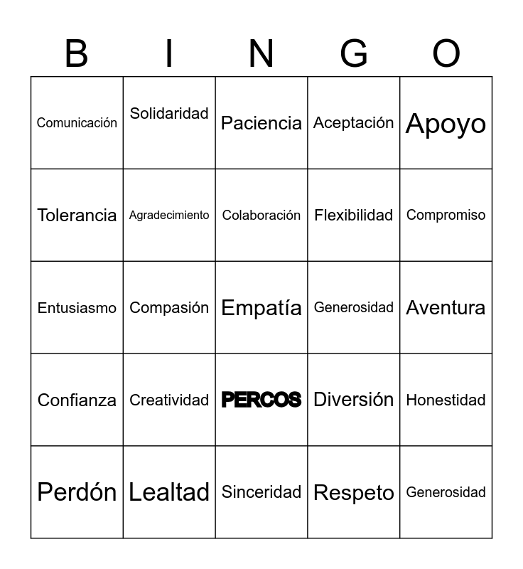 This bingo card has 25 words: Confianza, Lealtad, Empatía, Respeto, Apoyo, Comunicación, Solidaridad, Paciencia, Generosidad, Honestidad, Tolerancia, Agradecimiento, Sinceridad, Diversión, Compromiso, Perdón, Compasión, Colaboración, Flexibilidad, Aventura, Entusiasmo, Creatividad, PERCOS, Aceptación and Generosidad.