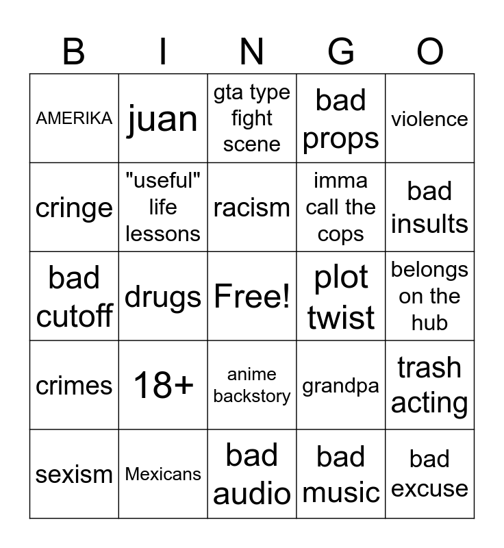 This bingo card has a free space and 24 words: 18+, Mexicans, racism, sexism, violence, AMERIKA, cringe, juan, plot twist, anime backstory, imma call the cops, bad cutoff, grandpa, trash acting, "useful" life lessons, bad music, belongs on the hub, gta type fight scene, bad insults, drugs, bad excuse, crimes, bad props and bad audio.
