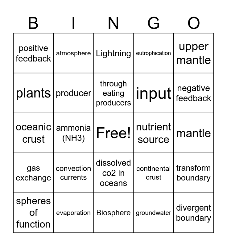 This bingo card has a free space and 71 words: hydrosphere, atmosphere, Lithosphere, geosphere, Biosphere, Dead zone, eutrophication, system, input, output, spheres of function, feedback loop, negative feedback, positive feedback, crust, oceanic crust, continental crust, upper mantle, lower mantle, mantle, convection currents, divergent boundary, transform boundary, convergent boundary, mountain building, subduction, outer core, inner core, pressure, biogeochemical cycle, evaporation, transpiration, condensation, runoff, groundwater, aquifer, carbon dioxide, carbonate rocks, plants, animals, dissolved co2 in oceans, cellular respiration, gas exchange, volcanic activity, deforestation, wood burning, combustion (fossil fuels), producer, consumer, decomposer, photosynthesis, makes up DNA, RNA, and cell membranes, nutrient source, weathering, mining, through water, through eating producers, through eating organisms, fertilizers, detergents, nitrogen, N2, ammonia (NH3), nitrate (No3-) or nitrite (NO2-), Specialized bacteria, human technology, Lightning, Nitrogen Fixation, Nitrification, Denitrification and Haber-Bosch Process.