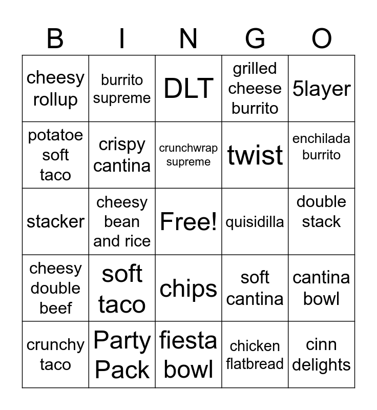This bingo card has a free space and 24 words: crunchy taco, soft taco, crunchwrap supreme, chicken flatbread, 5layer, cheesy rollup, burrito supreme, DLT, quisidilla, double stack, stacker, crispy cantina, soft cantina, cantina bowl, potatoe soft taco, Party Pack, fiesta bowl, grilled cheese burrito, enchilada burrito, cheesy double beef, cheesy bean and rice, chips, twist and cinn delights.