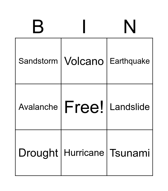 This bingo card has a free space and 11 words: Tornado, Hurricane, Tsunami, Drought, Volcano, Earthquake, Landslide, Wildfire, Avalanche, Sandstorm and Flood.