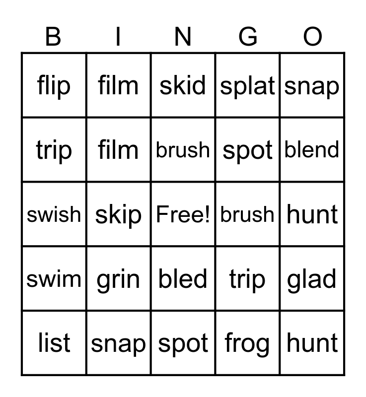 ⚠ This card has duplicate items: crab (2), blend (2), list (2), glad (3), frog (2), vent (2), film (2), swish (2), brush (2), shelf (2), bled (2), sled (2), hunt (2), snap (2), rest (2), trip (2), skip (3), flip (2), melt (2), spot (2), grin (2), swim (2), splat (2), skid (2), grip (2), grid (2), snip (2), swig (2), belt (2), mist (2), fist (2)