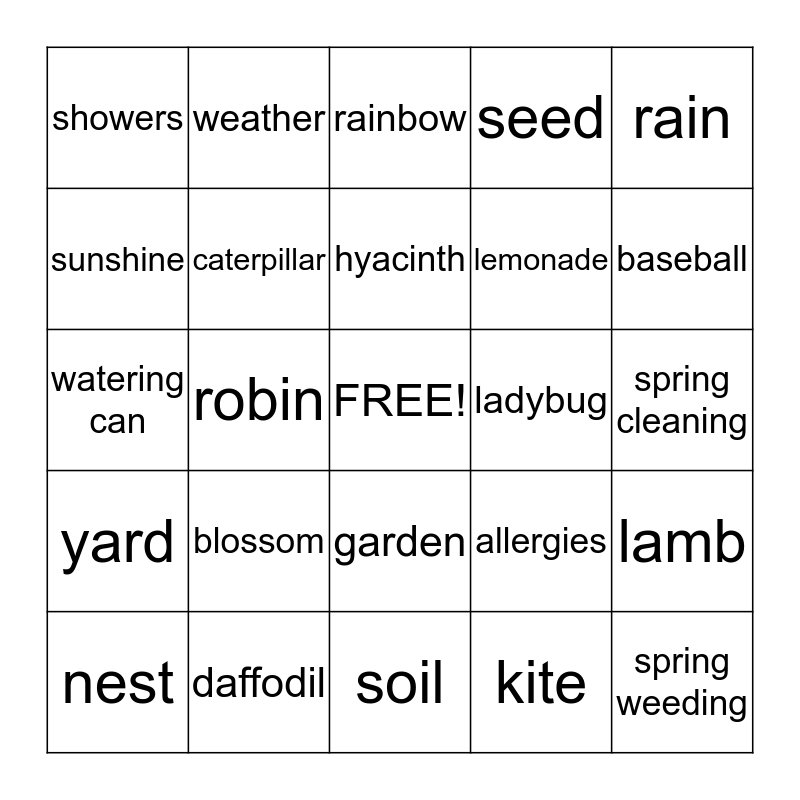 This bingo card has a free space and 24 words: blossom, daffodil, hyacinth, nest, rain, showers, sunshine, weather, ladybug, garden, lemonade, watering can, allergies, lamb, caterpillar, kite, spring cleaning, rainbow, baseball, robin, spring weeding, yard, seed and soil.