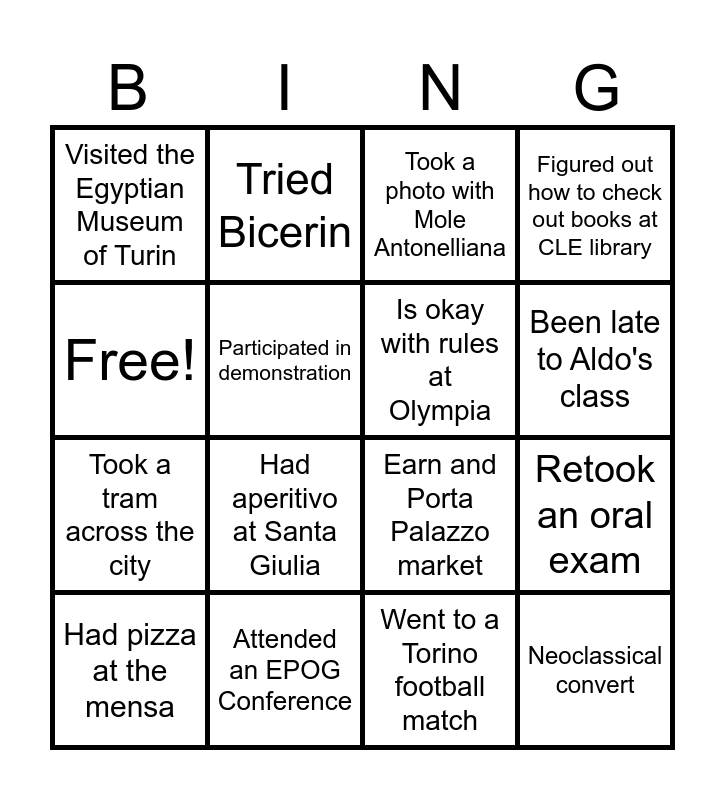 This bingo card has 16 words: Attended an EPOG Conference, Retook an oral exam, Took a photo with Mole Antonelliana, Visited the Egyptian Museum of Turin, Took a tram across the city, Tried Bicerin, Earn and Porta Palazzo market, Went to a Torino football match, Free!, Participated in demonstration, Had pizza at the mensa, Figured out how to check out books at CLE library, Had aperitivo at Santa Giulia, Been late to Aldo's class, Is okay with rules at Olympia and Neoclassical convert.
