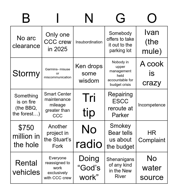 This bingo card has a free space and 30 words: Everyone reassigned to work exclusively with CCC crew, Less trucks than people, Smart Center maintenance mileage greater than CCC, “You can fire me but you can’t tell me what to do”, No arc clearance, Insubordination, Garmins- misuse or miscommunication, No radio, Repairing ESCC reroute at Parker, Doing “God’s work”, Incompetence, No water source, Shenanigans of any kind in the New River, 41 loads pack in, A cook is crazy, Drive time or road conditions in the Yolla Bollys, Smokey Bear tells us about the budget, $750 million in the hole, Another project in the Stuart’s Fork, Ivan (the mule), Something is on fire (the BBQ, the forest…), Mule wreck, Only one CCC crew in 2025, Nobody in upper management held accountable for budget crisis, Stormy, Somebody offers to take it out to the parking lot, HR Complaint, Rental vehicles, Ken drops some wisdom and Your job duties are going to change dramatically.