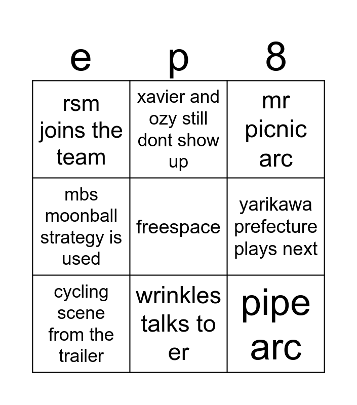 This bingo card has a free space and 8 words: yarikawa prefecture plays next, mr picnic arc, xavier and ozy still dont show up, cycling scene from the trailer, rsm joins the team, pipe arc, mbs moonball strategy is used and wrinkles talks to er.