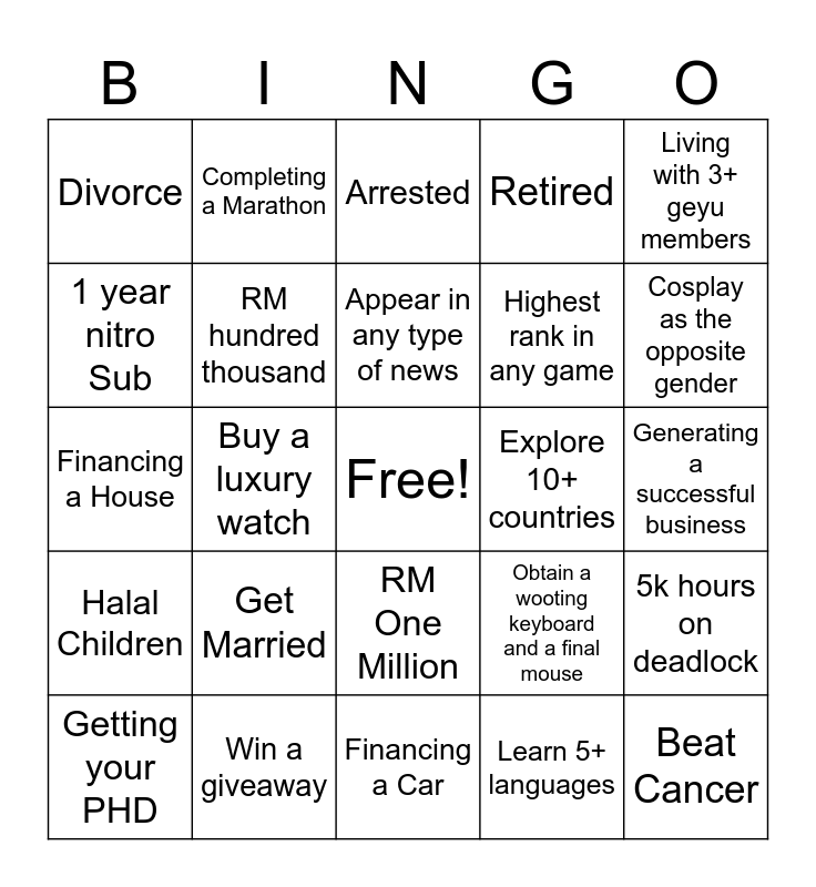 This bingo card has a free space and 24 words: Get Married, Win a giveaway, Appear in any type of news, Getting your PHD, Living with 3+ geyu members, Divorce, 1 year nitro Sub, Completing a Marathon, Explore 10+ countries, RM One Million, Highest rank in any game, Financing a House, Obtain a wooting keyboard and a final mouse, 5k hours on deadlock, RM hundred thousand, Learn 5+ languages, Generating a successful business, Arrested, Cosplay as the opposite gender, Buy a luxury watch, Beat Cancer, Halal Children, Retired and Financing a Car.