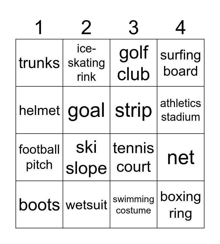 This bingo card has 20 words: net, skis, golf club, bat, boots, helmet, wetsuit, trunks, football pitch, ice-skating rink, ski slope, tennis court, goal, boxing ring, strip, racket, athletics stadium, surfing board, swimming costume and goggles.